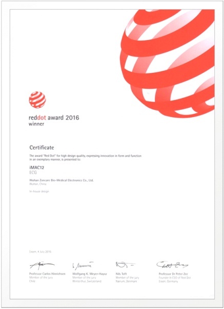 中旗公司研制的iMAC12 平板心电图机以其卓越的性能表现及其创新的设计理念从5200余件参赛作品中脱颖而出,荣获世界工业设计至高殊荣——红点产品设计大奖!