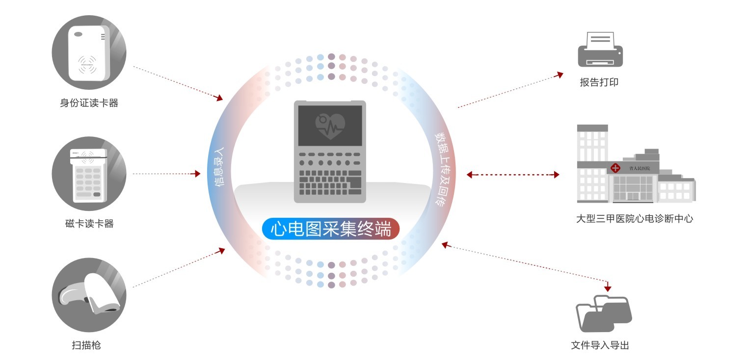 标配有线、无线Wifi联网功能,支持XML、HL7、DICOM等国际通用标准心电信息传输格式